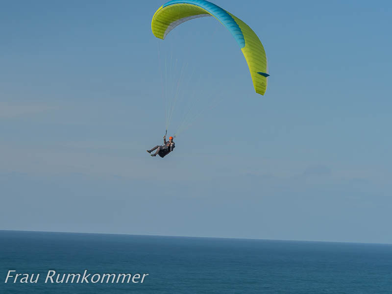 Und dann verstehen wir, warum hier mehrere Wohnmobile aus Norwegen, Deutschland, Frankreich und der Schweiz geparkt sind. Es sind die Unterkünfte von Gleitschirm-Fliegern. Offenkundig ist hier der Wind gut geeignet, um über der Klippe zu fliegen und Runden zu drehen.